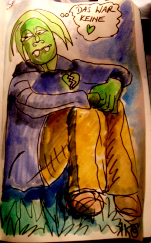 Danke Leute für Eure fleißigen Kommentare, deshalb muss ich auch mehr produzieren, um das ganze Geleernte versuchen umzusetzen. Ist aber besser so, als auf die großen Würfe zu warten, die eh nicht kommen. Daher kommt doch noch heute was Neues: Und ich muss dazu sagen, dass wieder solche überflüssigen STriche dabei sind, weil ich nicht vorzeichne, das sind die Originale, werde aber in Zukunft wieder vorzeichnen probieren. Also ich finde den Inhalt nicht so gut bei dem folgenden Bild, aber ich habe versucht, den Körper und die Körperhaltung mehr realistischer zu zeichen. Extra für Dich Hiller habe ich die Hände genauer gemalt, passt das so? Und die Colorierung taugt mir zur Zeit immer, und Euch? ;(