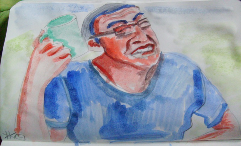 ich finde es bis jetzt deine beste Arbeit. Ausdruck wie immer top und auch die Körperhaltung find ich super. Ich könnt mir den Typ echt genau so vor mir sitzend vorstellen, wie er die Kaffeetasse schwingt und gerade etwas erzählt. Colorierung (bis auf die blauen Haare) auch gut. Vor allem die Hautschattierungen wirken natürlich.