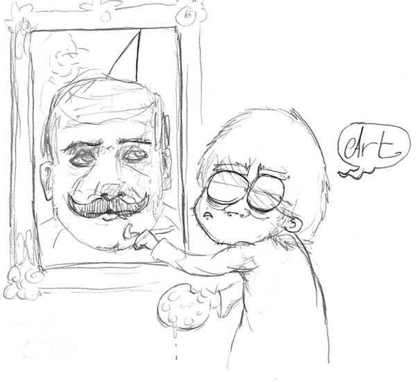Egal. Deine Skizzen finde ich toll. Irgendwie pfiffig. Wenn ich aber pingelig sein will: An dem Mann auf dem Gemälde ist was komisch, vor allem wenn man die Abbildung nur fingernagelgroß betrachtet. Irgendwas Hundeschnauziges hat der. :)