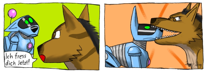Dieser Beitrag wurde bereits 1 mal editiert, zuletzt von »SpaceDog« (14. September 2012, 11:01) aus folgendem Grund: Hab im vorletzten Panel vergessen die Augen vom i-Cybie rot zu färben.