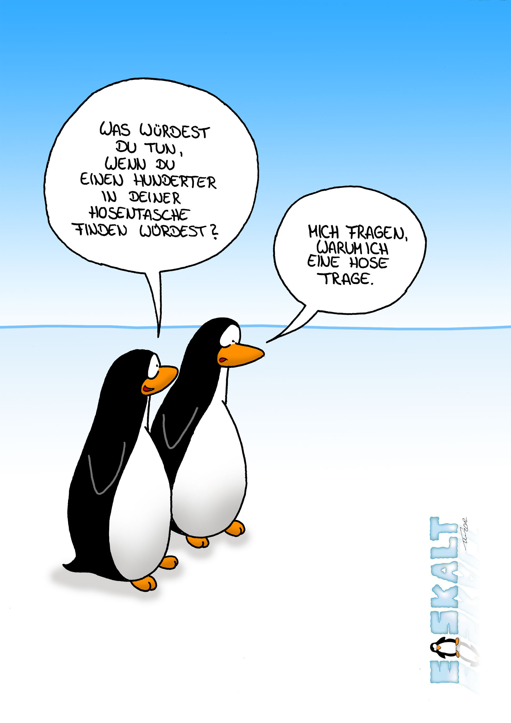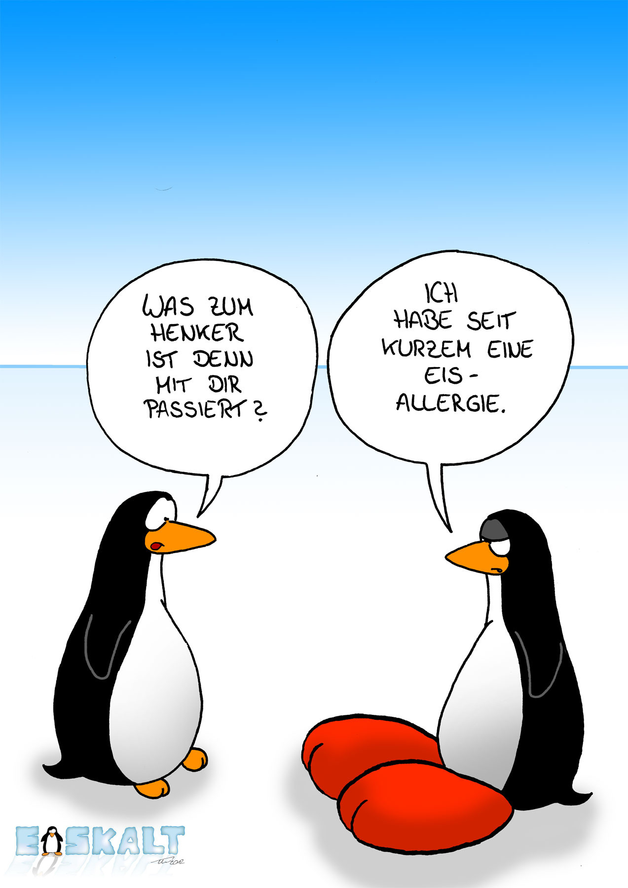 @Kiwazo: Zum Technischen Part kann ich wenig sagen, da ich kein Experte in sachen Digitale Bildbearbeitung bin. Den KErn des Cartoons find ich aber gut, und das du dem Pinguin einen Namen gibts ist ein kleiner aber feiner Detail. Vielleicht haette man noch irgendwo einen kleinen Eisberg, oder eine rumliegende Karnevalsmütze Zeichenen können. Alles in allem gibt das ganze für mich dennoch ein in sich abgerundetes Bild.