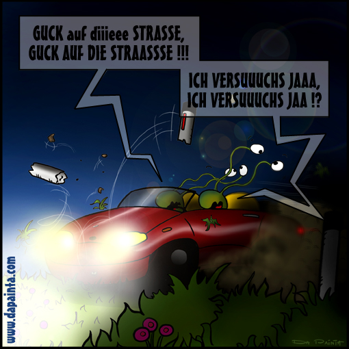 Aaalso... Beim zweiten hätte ich die Schere größer gemacht, damit es unmißverständlich ist. Beim Cabrio-Cartoon muss ich sagen, Schöne, stimmungsvolle Koloration, sehr aufwändig, schön anzusehen, aber für einen Cartoon in dieser Form ungeeignet. Wäre eher was für einen Comic. Oder?
