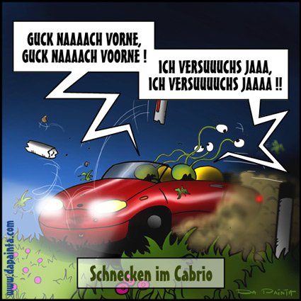 Hmm...für nen Cartoon ist es wirklich etwas überladen, und extra ne Geschichte drumrumschreiben damits in nem Comic vorkommen kann ist auch doof :D Wie wärs denn mit nem Comicstrip? noch zwei Bilder davor, dann haste ne schöne Pointe am Schluss! (z.B. 1.Bild: Der Wagen fährt an und die Schnecke ruft irgendwas wie: "WOOW, ganz schön schnell", und im nächsten Bild macht der Wagen einen Satz nach vorne und braust mit Tempo zweihundert davon?!)