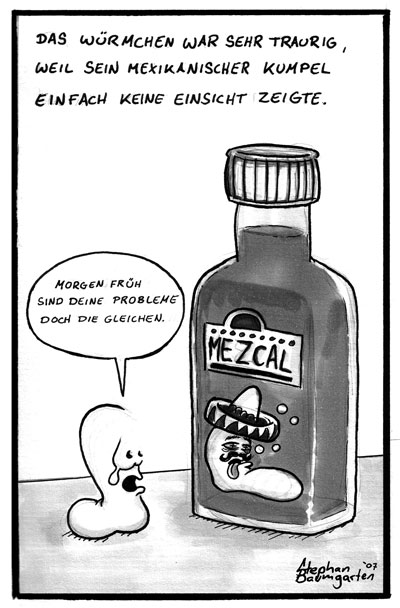 Tequila wird nie mit Wurm getrunken. Die Maguey-Schmetterlingslarve (es ist ist gar kein Wurm!) landet nur in Mezcal-Flaschen, und zwar meist in denjenigen, die für den Export bestimmt sind. Ursprünglich soll es sich dabei um einen Marketinggag gehandelt haben und das Getier verleiht dem Mezcal tatsächlich ein etwas anderes Aroma.