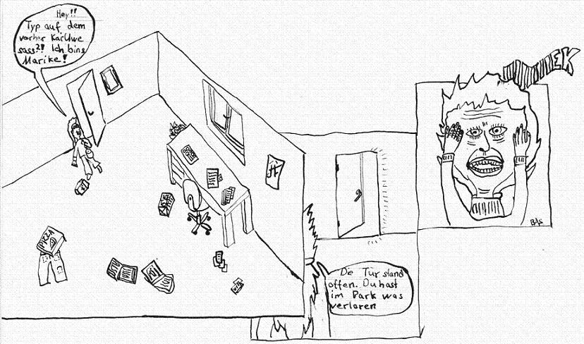 8.Zu allem Überfluss stiefelt jetzt auch noch die Tussi aus dem Park durch die Haustür, weil sie "unseren Helden" (der ja jetzt fälschlicherweise Mareike/Marike heißt, weil wohl kaum jemand mitbekommen hat, das das von Rob nur ne Art eigenständiger Zwischenwurf war und TDD damit weitergemacht hat...ich übrigens auch nicht :D ) offensichtlich besuchen will.
