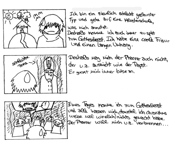 Aber ich glaube, dass es eifnach zu viel Text ist. Es ist eher eine geschriebene Geschichte mit ein paar kleinen Illustrationen am Rande als anders rum. Versuch doch einfach noch mehr mit den Bildern zu erzählen. Darauf kommt es schließlich beim Comic an. ;)