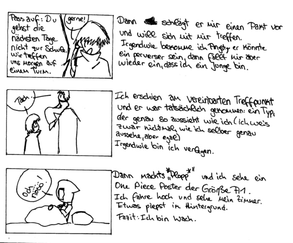 Lustige Szenen, aber sie ergeben zusammen nicht so den Über-Sinn wie in deinen anderen Traumcomics. Außerdem beschränkt sich das gesellschaftskritische Moment nur auf eine sinnlose Anspielung auf den zweiten Weltkrieg, was grundsätzlich lustig, aber leider viel zu kurz ist.