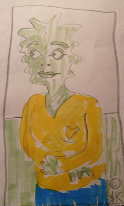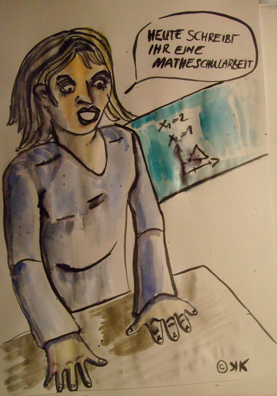 Der neue Versuch stammt wieder einmal aus meiner Fantasie, daher wird die Anatomie ziemlich mangelhaft sein, also Hände, Mund, usw. Was ich probiert habe, ist einen leicht bedrohlichen Ausdruck in das Gesicht zu bringen, ist mir nur teilweise gelungen. Die großen Augen habe ich für Hiller gezeichnet. Und das Thema Schule ist für einige von euch ja noch ein fast tägliches Thema, bei mir ist es nur noch eine Erinenrung. Und die Lehrerin sollte eigentlich etwas älter aussehen, das ist mir leider nicht leicht gefallen, die Farben taugen mir wieder einmal. Und ich habe die Autlines mit Tinte gemalt, das hat mir Spaß gemacht, wie findet Ihr es es?