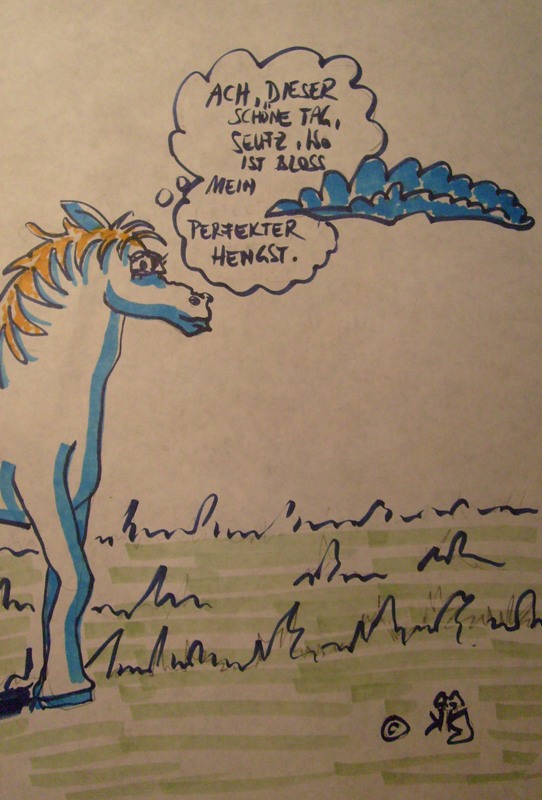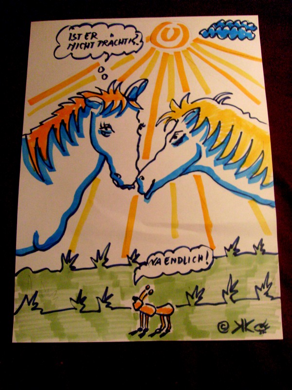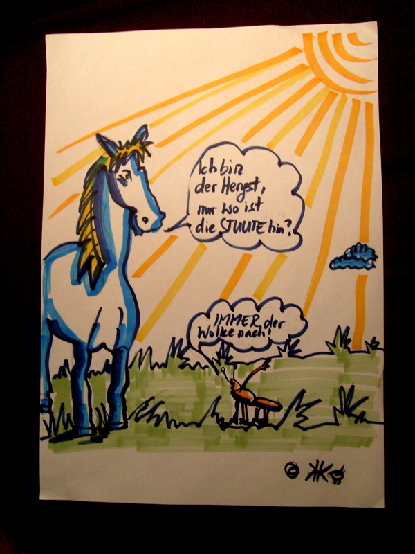 Hi Hiller, hi Phil, danke für Euer Lob, die Kritik passt auch.Das mit dem Gras habe ich beherzigt, dafür habe ich die Schrift in den Sprechblasen undeutlich gemacht. Grrr. Wie findet Ihr mein zweites Pferd und die Ameise?