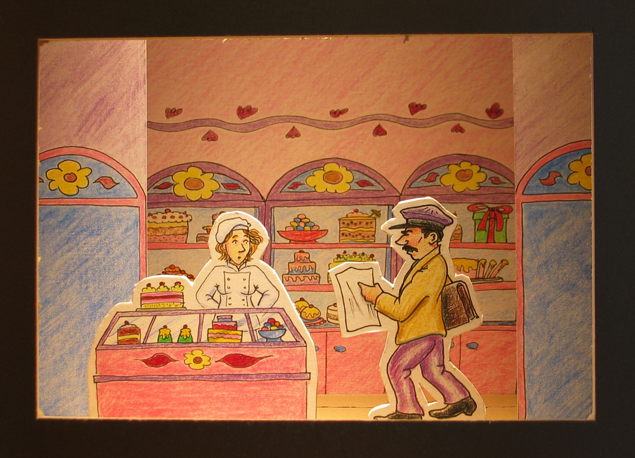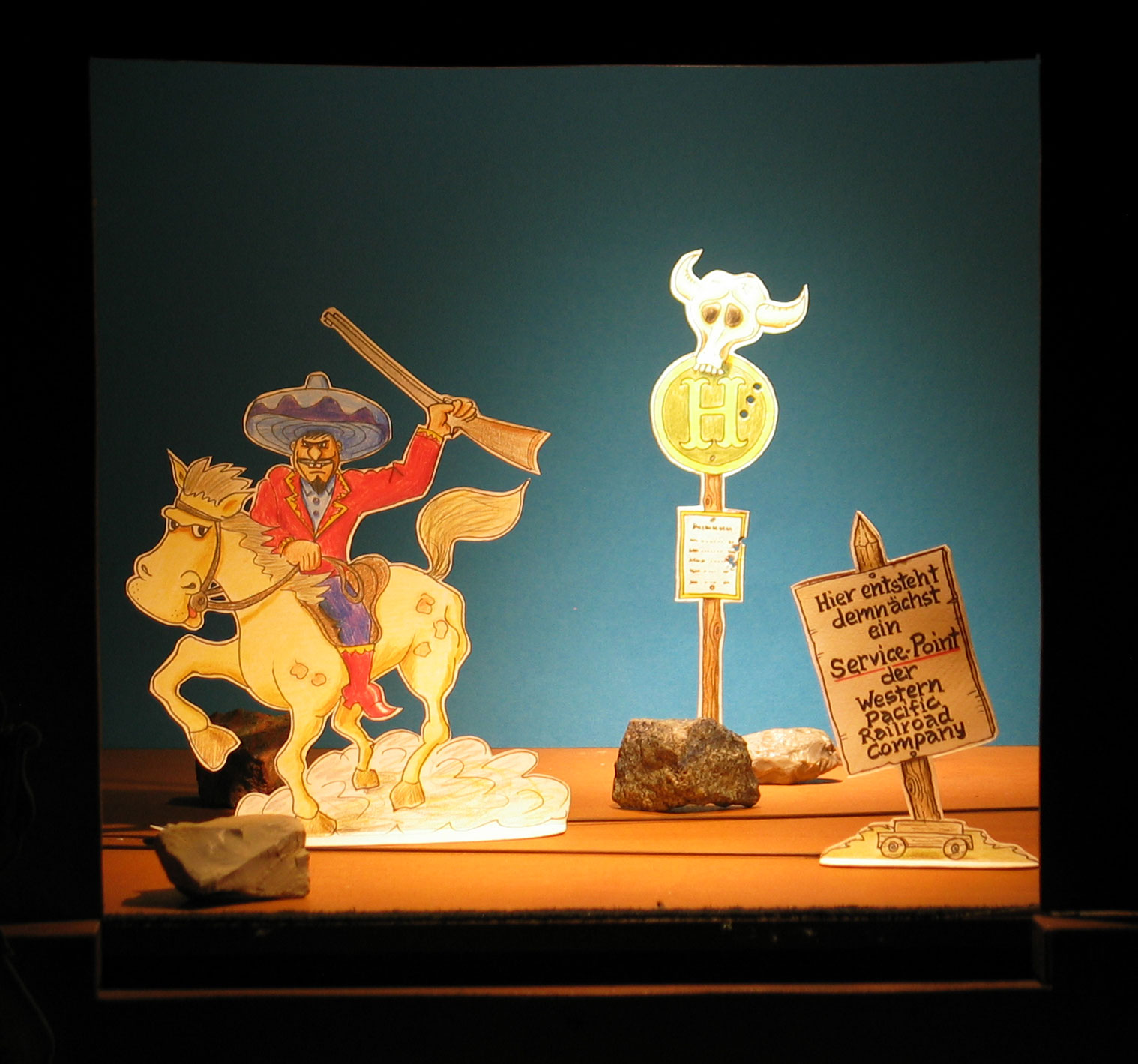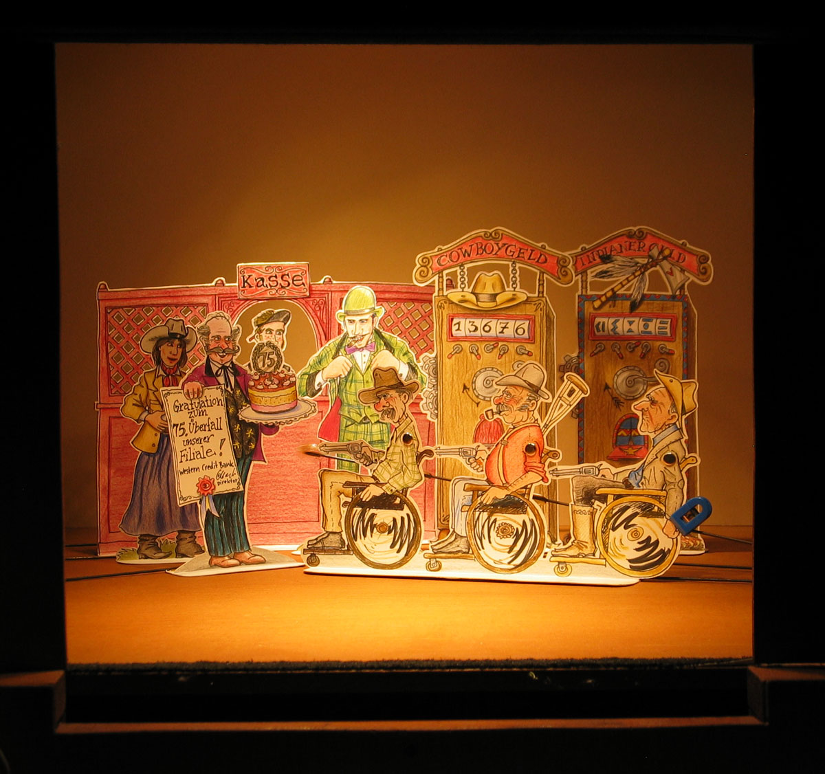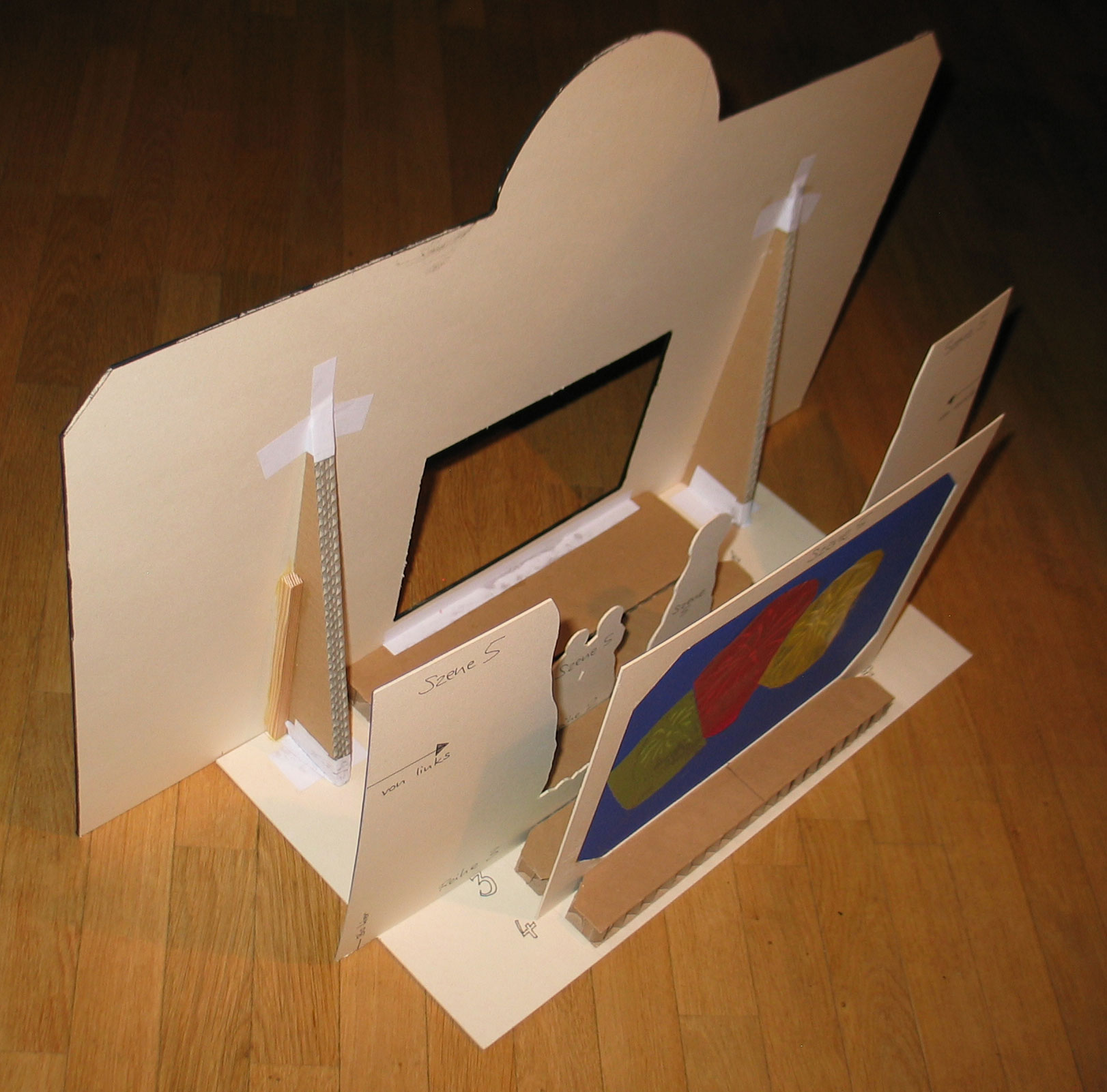Anlässlich eines 80sten Geburtstags haben meine Frau und ich ein kurzes Papiertheaterstück erarbeitet, das am Sonntag auf der extra dazu gebastelten kleinen Bühne zur Aufführung kam. Die Figuren sind etwa 10 cm groß.