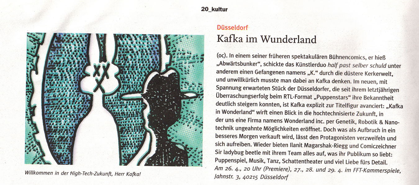 Also hier geht's eigentlich nicht um Papiertheater, aber zumindest wird hier mit verschiedensten Mitteln wie z. B. Comic, Puppen- und Schattentheater Kafka auf die (große) Bühne gebracht.