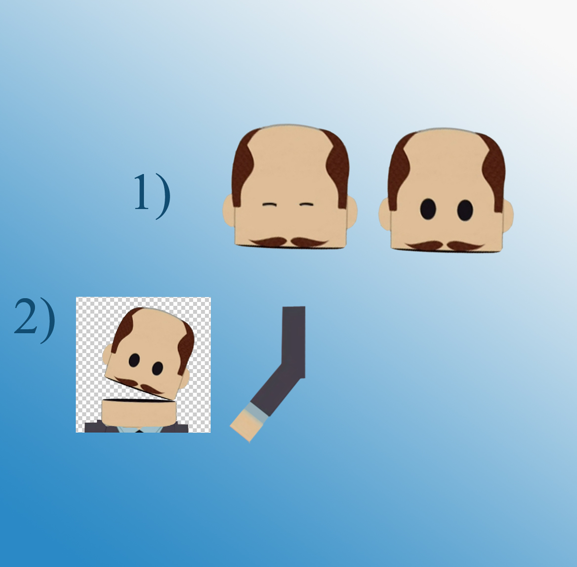Qualle wollte unbedingt meine Videos sehen, die ich im South Park Stil animiert habe. Ich habe die Ferien über nur sehr langsames W-Lan , und konnte irgendwie keins hochladen, sie funktionieren aber alle nach dem selben Prinzip: Man kann Photoshop Ebenen ein und ausblenden, und so z.B. die Augen zwinkern lassen (1),und man kann dadurch, dass es Ebenen sind, Körperteile einzeln drehen und verschieben. Ich hab hier einen Kanadier, weil er recht simpel ist, und sich so hervorragend als Anschauungsmaterial eignet.
