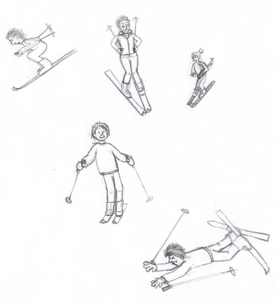 Skifahrer zu zeichnen, ist zie,lich schwierig. Weil man immer aufpassen muss, wo wird jetzt die Hüfte rausgedrückt, auf welchem Ski ist die Belastung. Was ist mit dem Knie.
