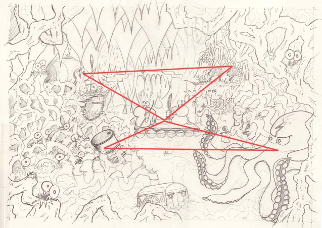 Hab mal irgendwo gelesen, dass man mit so zwei Dreiecken gut ein Bild aufbauen kann. Die Hauptakteure befinden sich am Berührungspunkt dieser Dreiecke.
