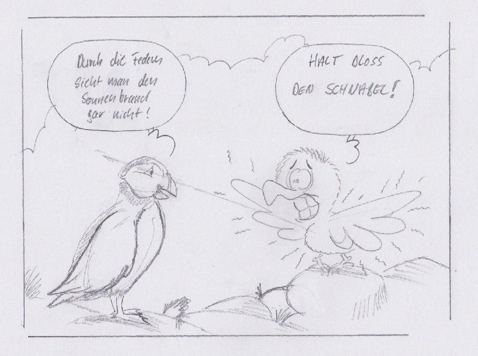 Ich habe tatsächlich lange überlegt, wie ich den Flachwitz zeichnerisch umsetze. Ich habe viele Vorzeichnungen angefertigt