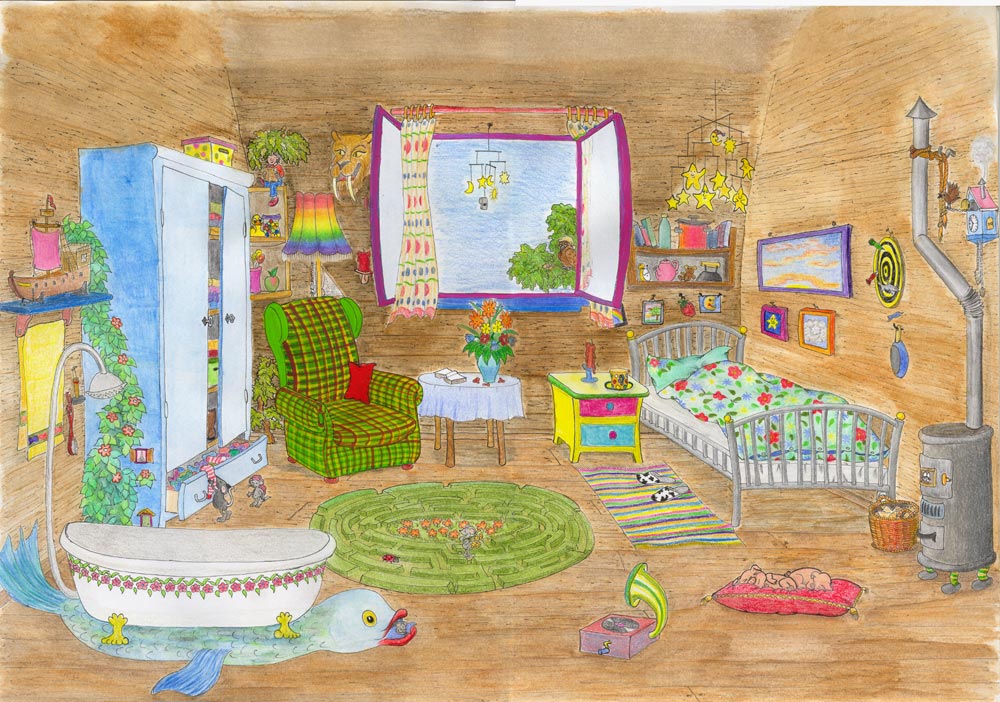 Also coloriert ist dies jetzt mit Polychromos (kleinere Flächen), wasservermalberen Buntstiften (Wände und Boden) und Acryl (Fensterrahmen und Sessel). Letzteres, weil der Sessel einen neuen Bezugsstoff benötigte. Ich zeig das erste Bild auch mal im Anhang