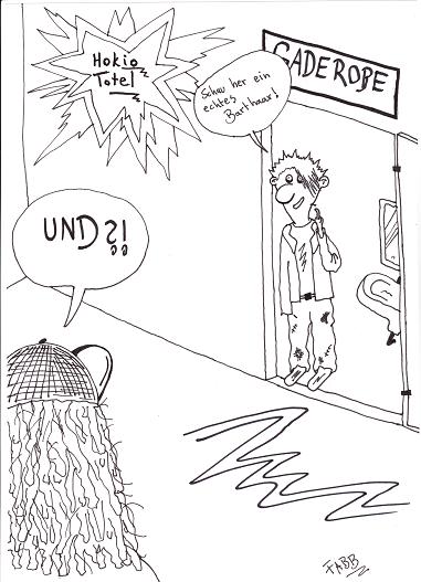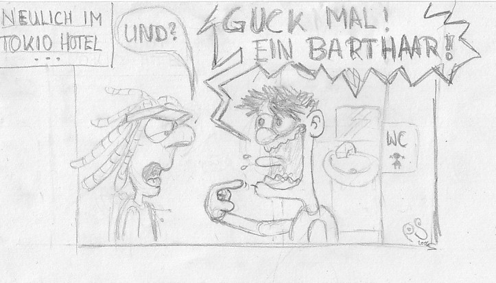 Die Perspektive hast du gut gezeichnet, aber ich hätte wohl eine andere Perspektive gewählt. Ich finde, der Gag kommt so nicht richtig rüber. Den Rastatyp nimmt man irgendwie viel zu spät wahr und für meinen Geschmack müsste man die Mimik mehr übertreiben.