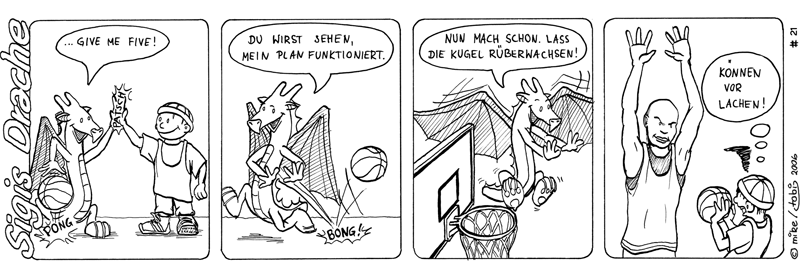 Also, ich brauche zur Zeit gut eine 1/2 bis 1 h für eine Vorskizze, bis alles so ist, wie es mir gefällt, dann rund 1,5 h bis mir die Vorzeichnung gefällt, anschliessend kommt eine 1/2 bis 3/4 h inken mit dazugehöriger Trockenzeit. Dann 2 mal einscannen, zusammenfügen, umrechnen, verbessern und zu letzt mit Titel versehen und für Web speichern. Sprich, wenn alles glatt geht eine weitere 1/2 h. Zusammen sind wir im Idealfall bei ca 3 h pro Strip.