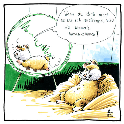 Aber ich finde den Text etwas holperig. Wie wärs mit: "Mit Deiner Einstellung wirst Du nie vorankommen!" Das reicht vollkommen aus. Der Leser sieht ja, dass der Hamster im Laufrad läuft und da ist ja schon der Gag. Er muss also nicht noch extra "...so wie ich" sagen.