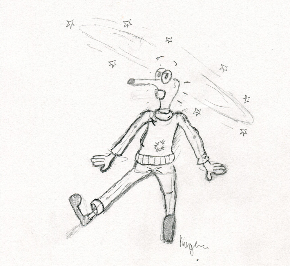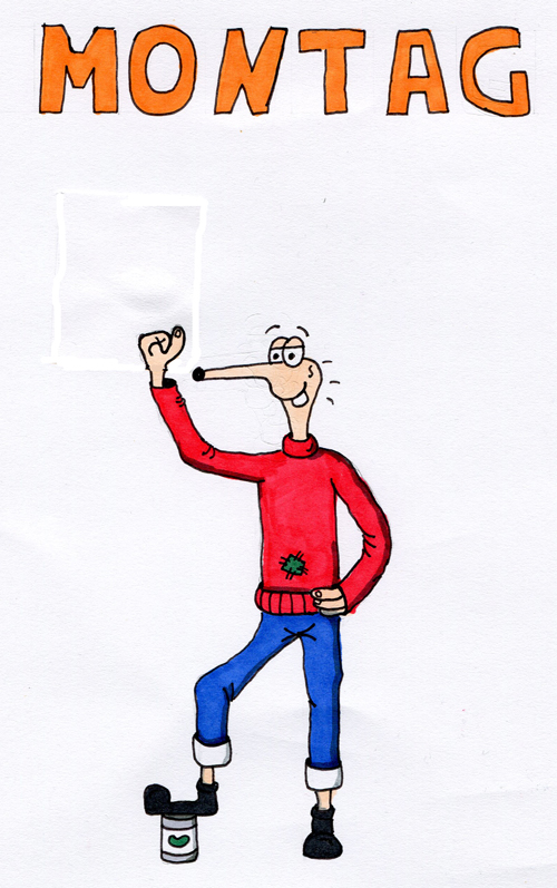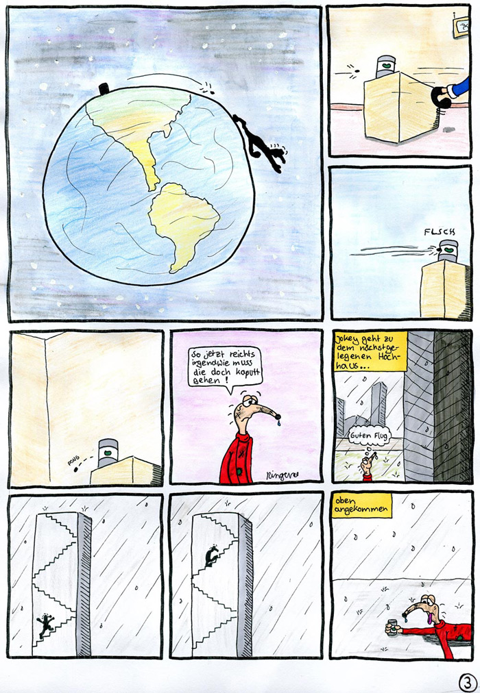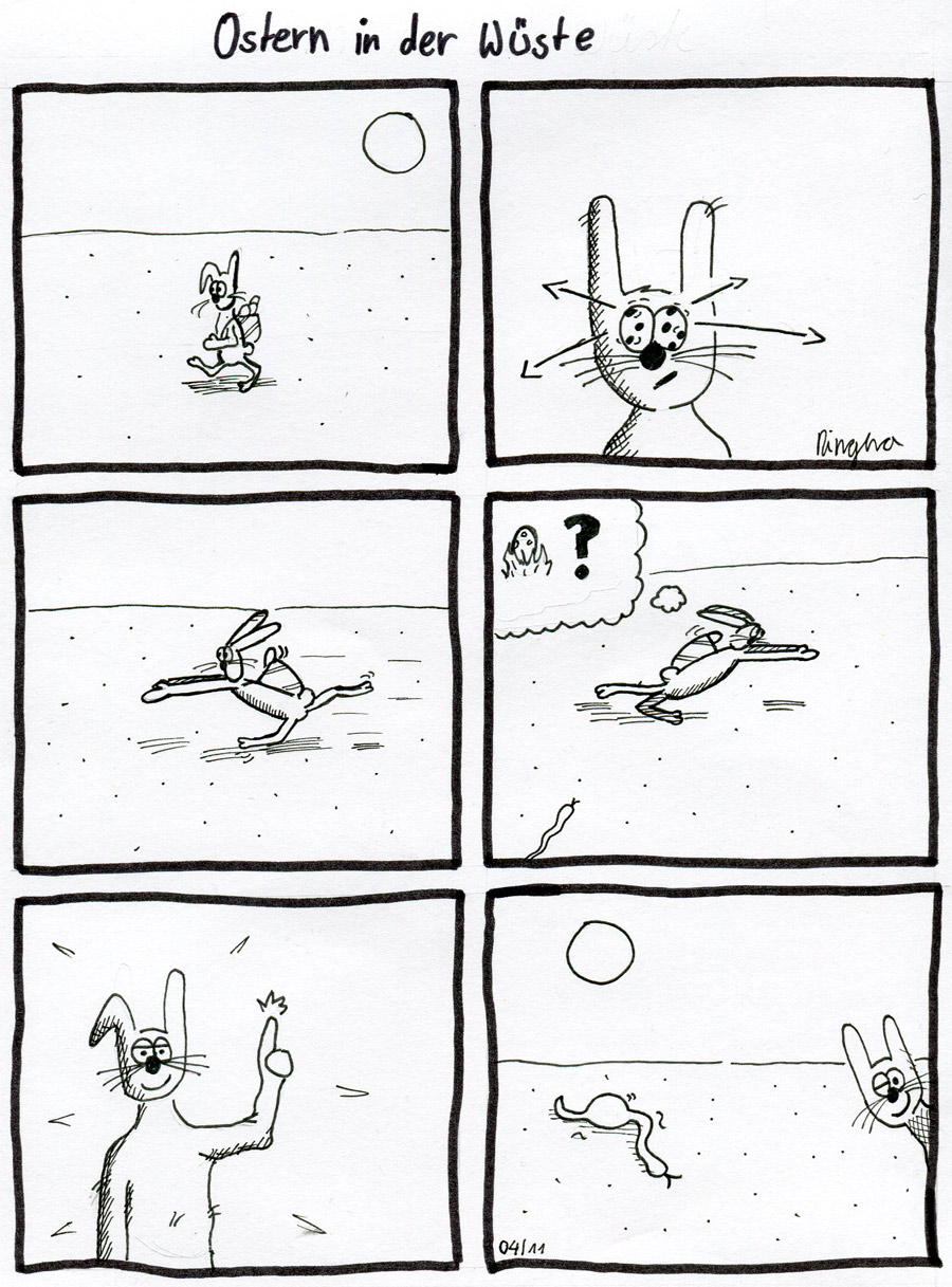 anschliesend ein größeres Panel aus der Vogelperspektive (meine eigentlich das gegenteil von nahaufnahme, wie heißts nochmal?) damit man sieht, das er verzweifelt und allein in der wüste ist und ringsrum nichts ist. Da würde dan auch die Gedankenblase reinpassen.Das Bild, wo sich der Hase umschaut (mit den Pfeilen) ist auch schwer verständlich. Stattdessen könntest du die ersten zwei Bilder durch zwei andere ersetzen: Eines in dem der Hase nach Links schaut, eines in dem er nach rechts schaut.