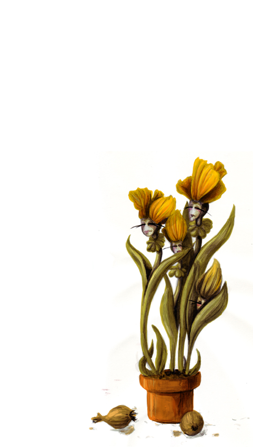 Das sind die Tratschenden Narzissen aus einer an Alice in Wunderland angelehten Geschichten von meiner Kumpelinin und mir ;) Frühling war nicht das konkrete Thema dieses Bildes. Ich wollte aber nur mal Frühling raus posauenen, weils bei uns gerade schneit :D Vielleicht hört's dann auf. Traurig hätten sie eigentlich nicht aussehen sollen. Da muss ich beim nächsten Bild drauf achten ;) Wird noch eine ganze Reihe von Blümchen geben.