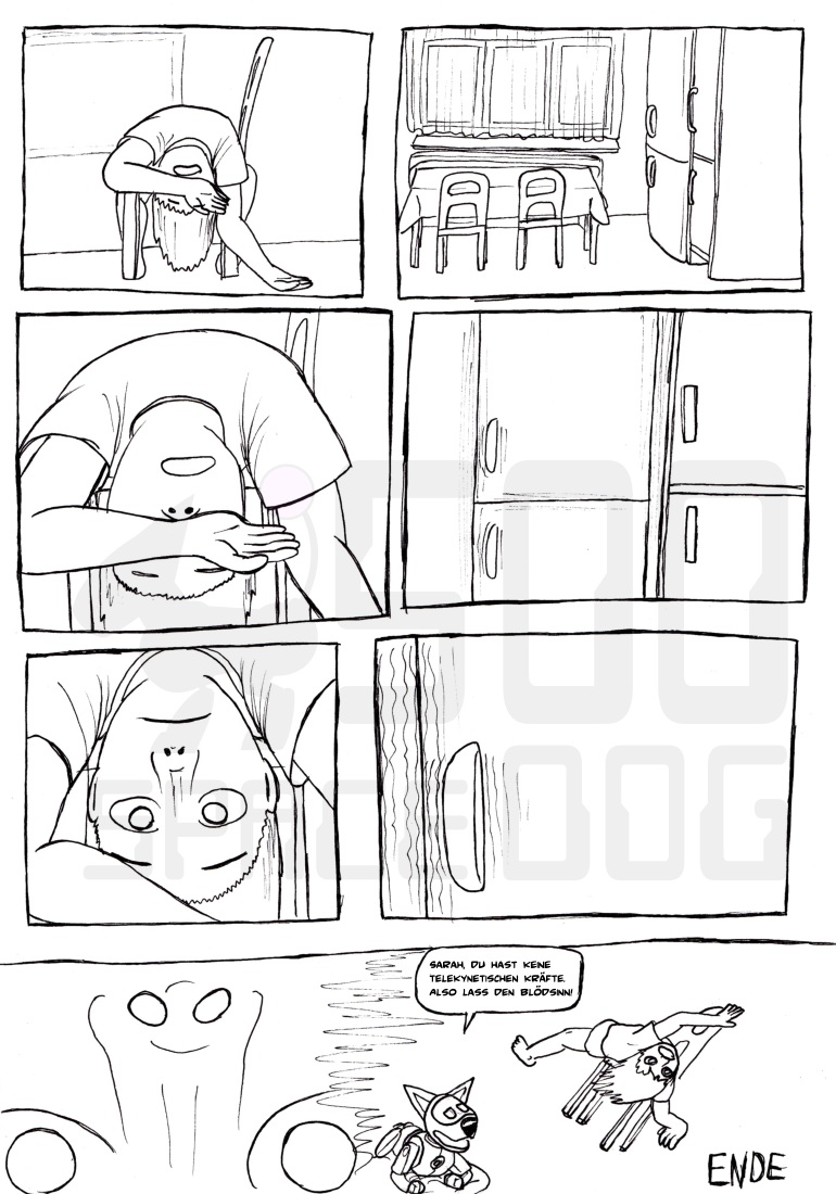 Einzige Kritikpunkte wären die etwas misslungene Figurenkomposition auf der ersten Seite im 7. Panel (du hast den Kopf des Hundes ohne Bezug einfach in das Panel eingefügt, was an schlechte Mangas erinnert) und die zu kurzen Beine des Jungen im letzten Panel der zweiten Seite.
