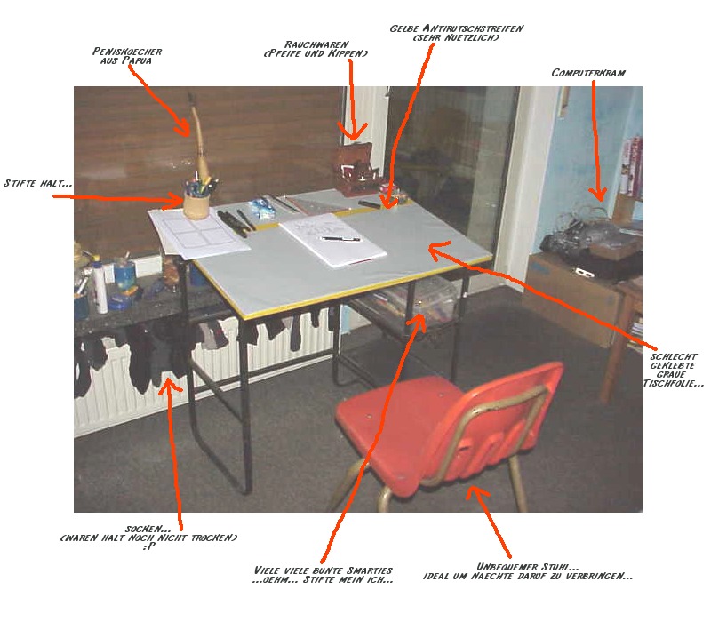Flix, das is ja orginool wie in deinen Comics gezeichnet! Altbauwohnung, der Angeberleuchttisch, 30er-Jahre-Verhör-Lampe und Ikea-Eimer "Knodd". So lässt's sich leben, nicht schlecht!