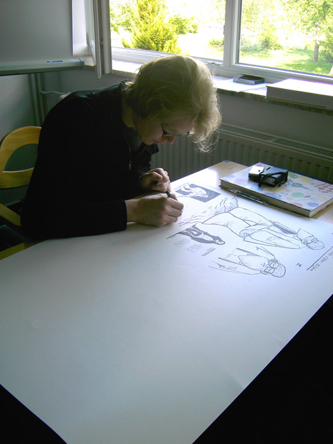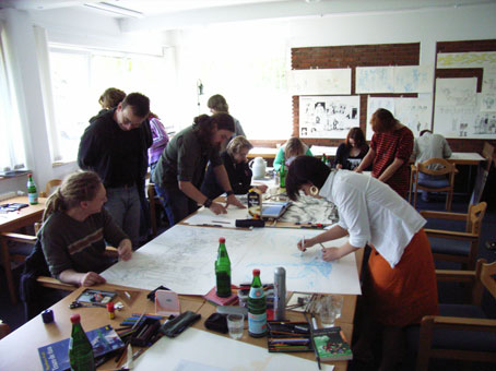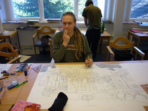 Fantastisch! Haben wir eigentlich auch Fotos von den anderen Zeichnungen? Mir fehlt das Hitlerzimmer vom Rasta und die schnabulaksche Straßenszene und das niedliche Gruppenbild vom Andi und das Summerhill an warmem Sommertag unter Bäumen an Klippe mit Möwen =)