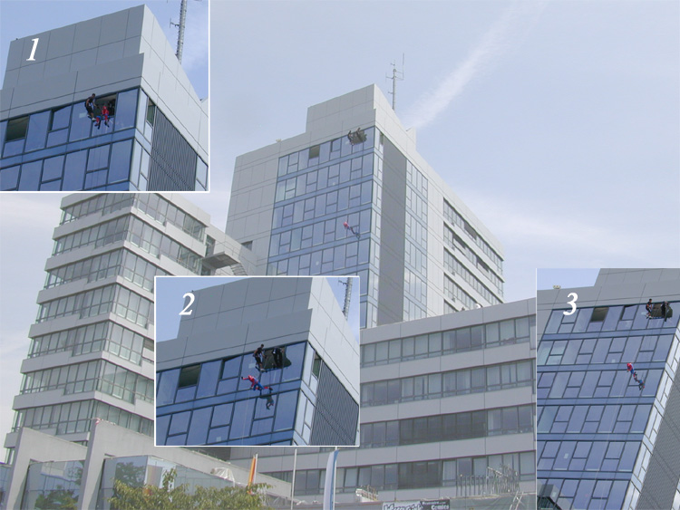 Er war auch da: The Amazing Spiderman läuft die Fassade des Erlangener Ratshaus herunter. Leider war mein Zoom etwas überfordert, näher wäre schöner gewesen. Wer wollte konnte übrigends selbst aus dem 14. Stock nach unten spazieren. Soweit ich es gesehen habe wurde das Angebot ausgiebig ignoriert ;)
