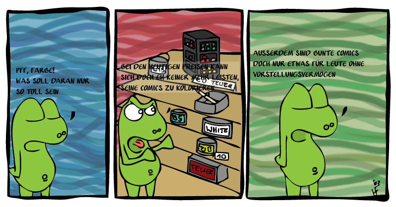 "Bei den heutigen Preisen kann es sich doch eh keiner mehr leisten, seine Comics zu kolorieren". Diesen Text fand ich eigentlich auch ganz witzig, da die meisten Webcomics ja am Computer entstehen, und die Farben daher nix kosten, aber die Idee hab ich irgendwie vermurkst. Was solls, wird der morgige Strip halt besser...