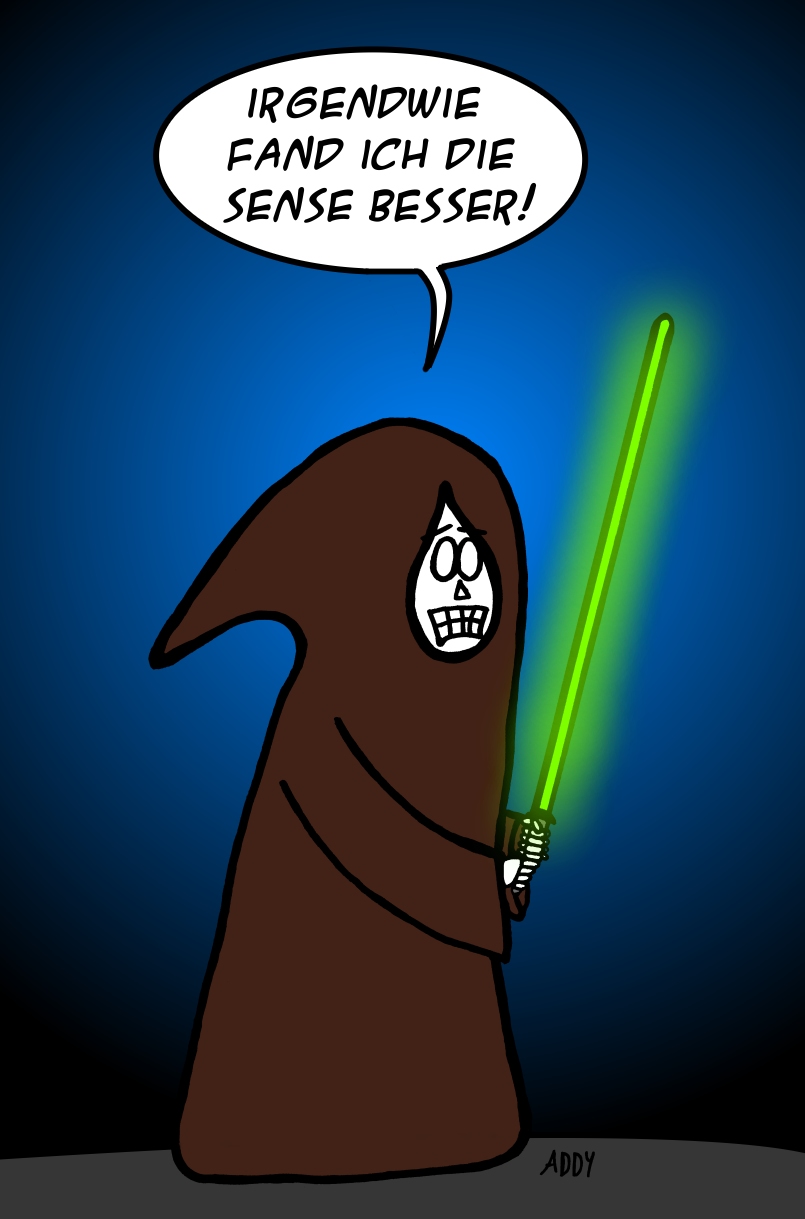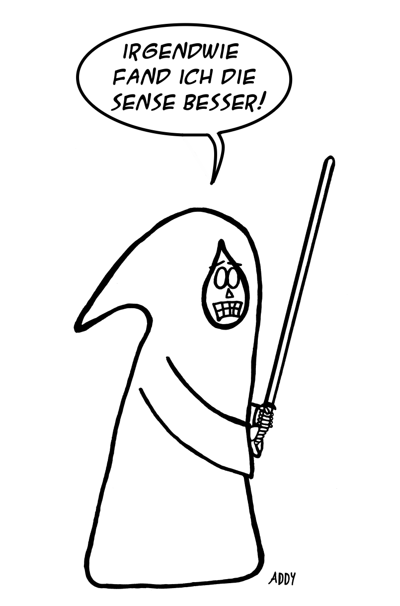 Die Zeichnng des Cartoons ist gut. Allerdings erkennt man erst in der Kolo, dass der Stock in der Hand des Sensemannes eigentlich ein Laserschwert ist. :D