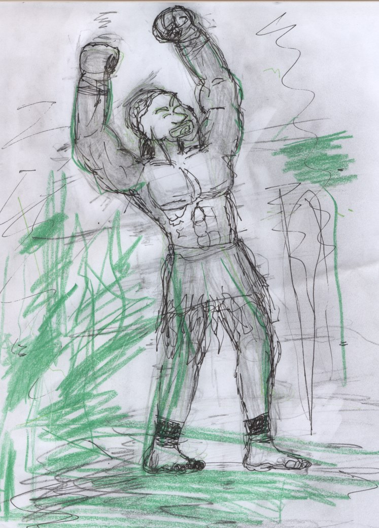 genau das soll folgendes bild sein, nur ausgearbeitet (blitze und anhöhe und auch reinzeichnung folgen), nur dass er sehr verbittert schreit (dazu hat mich übrigens kellerkinds bild inspiriert)!