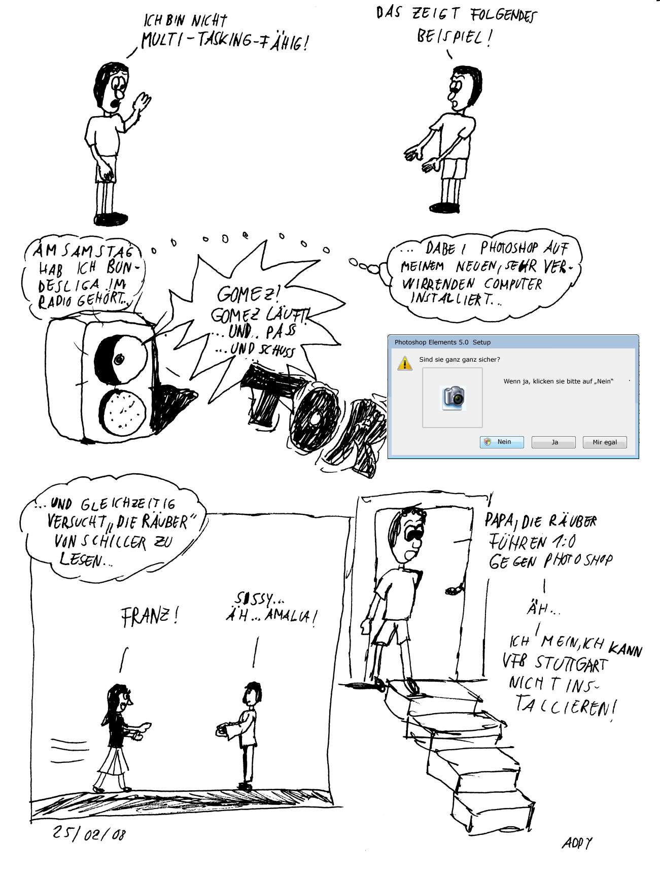 Ich hab sowas mal bei mir versucht, wobei es aber später am Komprimierungsverfahren gescheitert ist: [URL=http://www.kellerkomiks.de/kellerkind/kellerkind.php?id=2,3]http://www.kellerkomiks.de/kellerkind/kellerkind.php?id=2,3[/URL] siehe drittes Panel.