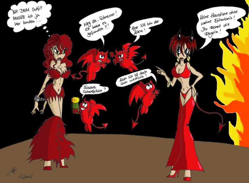 Sooo, mal wieder was Neues aus der Hölle. Die Reinzeichnung entstand schon im Fasching, aber irgendwie kam ich nie zum Colorieren. Insofern halt jetzt: Gefahren falscher Kostümwahl... ;)