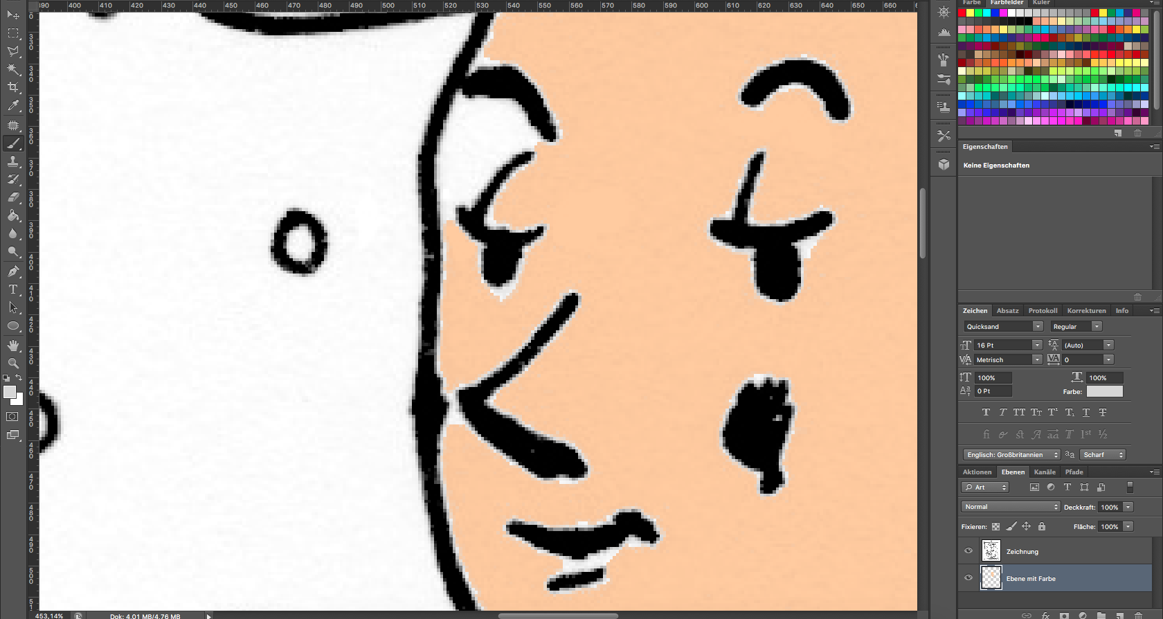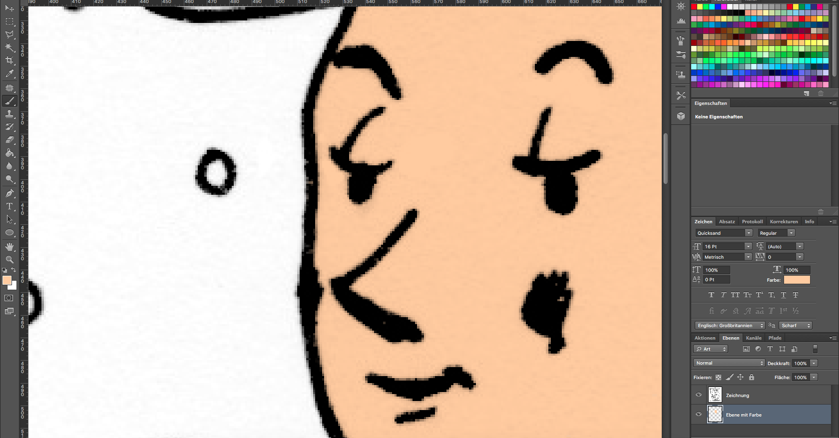 Dafür kannst du zum Beispiel so verfahren, dass du die Ebene mit deiner schwarz-weißen Linienzeichnung bei den Blendmodi auf "Multiplizieren" stellst und dann eine (oder mehrere) weitere Ebene/n untendrunter packst, auf die dann die Farbe kommt.