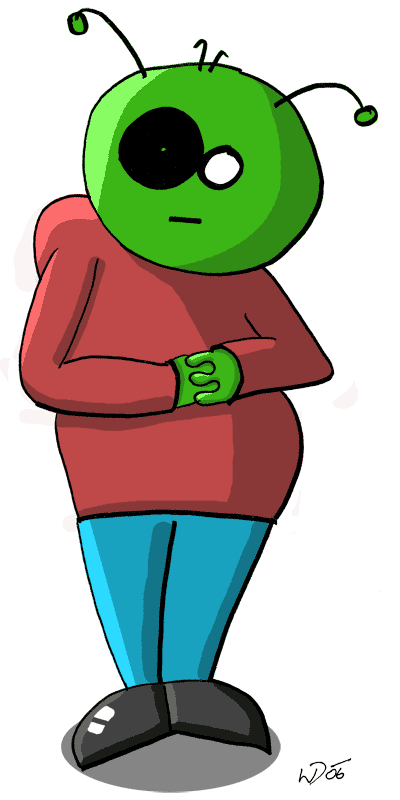 Dein Alien erinnert mich irgendwie so an Quasimodo ( keine ahnung ob das richtig geschrieben ist ) und an Mr. Burns keine Ahnung wieso aber es tut es. :P