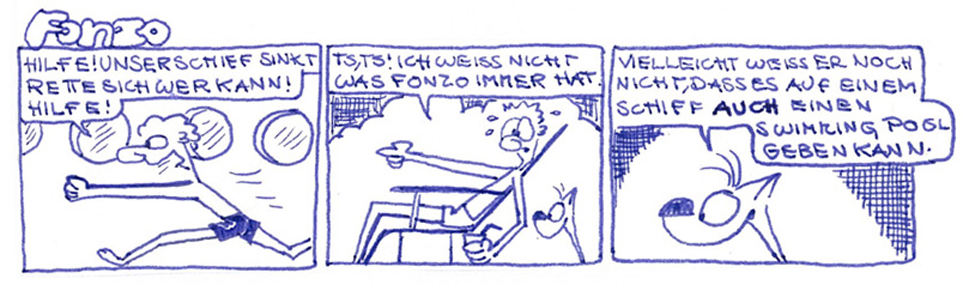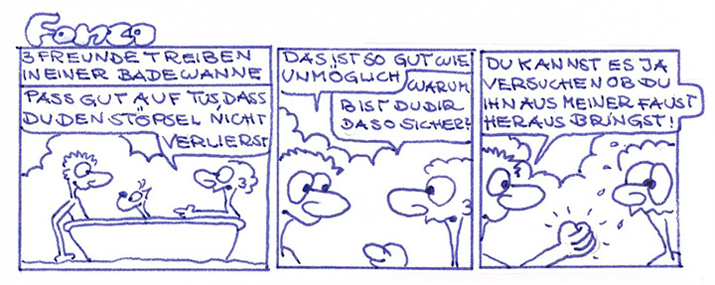 Die Hauptdarsteller dieser Comicstrips sind Fonzo (in Anlehnung an Gonzo, meiner Lieblingsfigur der Muppetsshow), sein Hund Robin und ein namenloser Freund (zumindest kann ich mich an den Namen nicht mehr erinnern). Die 3 sind auf einem Schiff unterwegs, erleiden dann Schiffbruch und treiben dann in einer Badewanne auf dem offenen Meer. Dabei erleben sie natürlich so allerlei Abenteuer....
