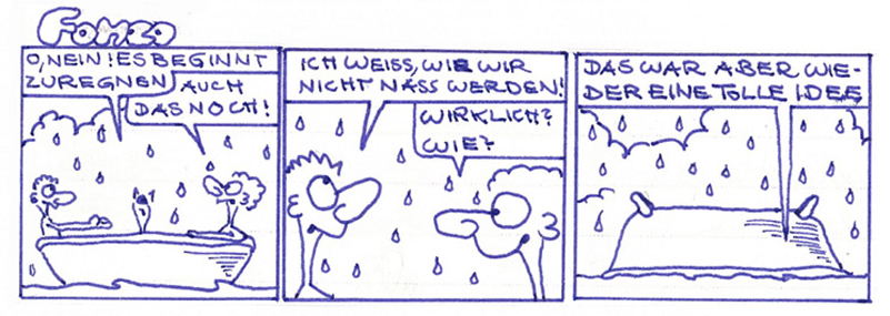 @Enzo: Du gehörst also auch wie ich zu der Gruppe Mensch, die panisch Angst hat, dass das Wasser aus der Badewanne ausläuft, während man drin sitzt. Da bin ich ja beruhigt, dass ich nicht der einzige bin :D . Ich brauch dann wohl nicht zu sagen, welcher der 3 Strips mein Favorit ist. Gonzo aus der Muppetshow musste ich erst mal googlen.