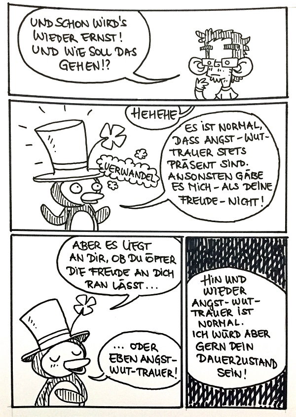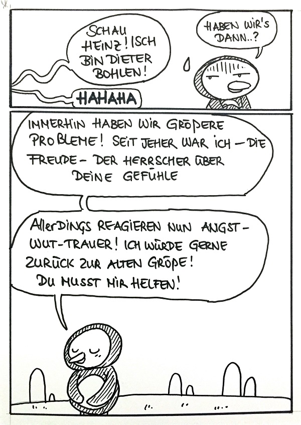 Das Ergebnis ist eben ein 12h Comic. Da ist das Problem, dass man von der ersten Sekunde an gegen die Zeit arbeitet und wirklich viel Planung (insbesondere im Bereich des Storytelling bzw Charakter Design) ist da nicht drinnen. Hier ist vieles spontan entstanden (so auch die Freude), die man wirklich - wenn man vor allem die "Freude" aus dem Film "Alles steht Kopf" vergleicht- auch anders hätte darstellen können.Nur widerstreiten die Gefühle bei Dir gar nicht so richtig. Es ist alles auf die Freude konzentriert, die aber, wie FrrFrr anmerkte, gar nicht so richtig als Freude rüberkommt. Ist aber bei einem Zwölf-Stunden-Comic absolut entschuldbar. Ich würde sagen: Mach den Comic doch bei Gelegenheit in Ruhe nochmal.
