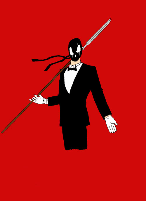 Venom im Anzug mit Kampfstab. Elegant mit wenig Linien gezeichnet. Könnte aber großzügiger und lebendiger sein. Liegt aber vielleicht auch nur an der GRöße.