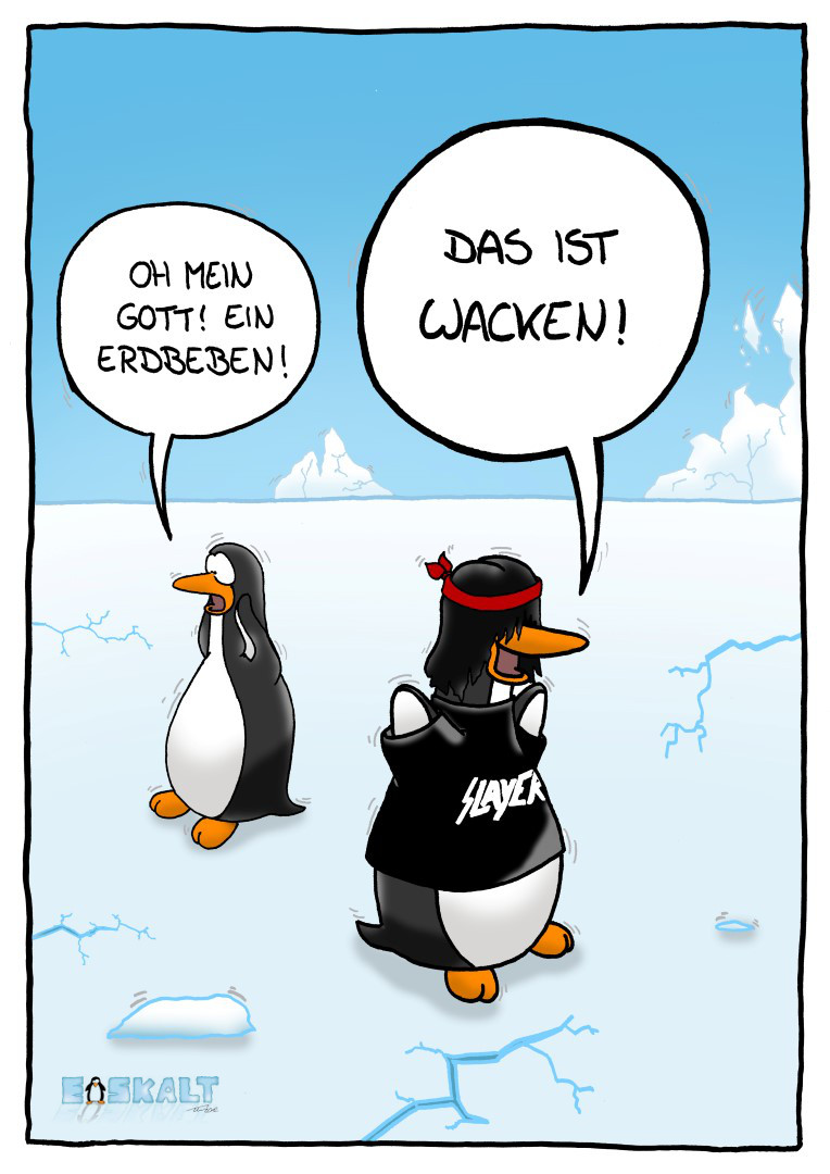 Daß der eine Pinguin ein Slayer-Shirt trägt, ist schon ein witziges Detail. Aber da frage ich mich: Warum ist er dann nicht nach Wacken gefahren?