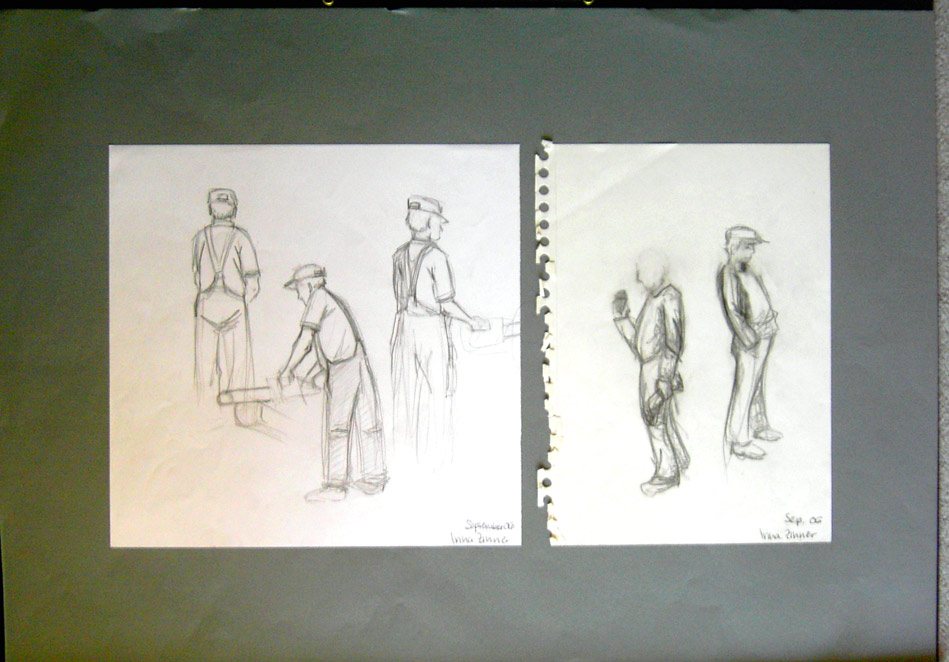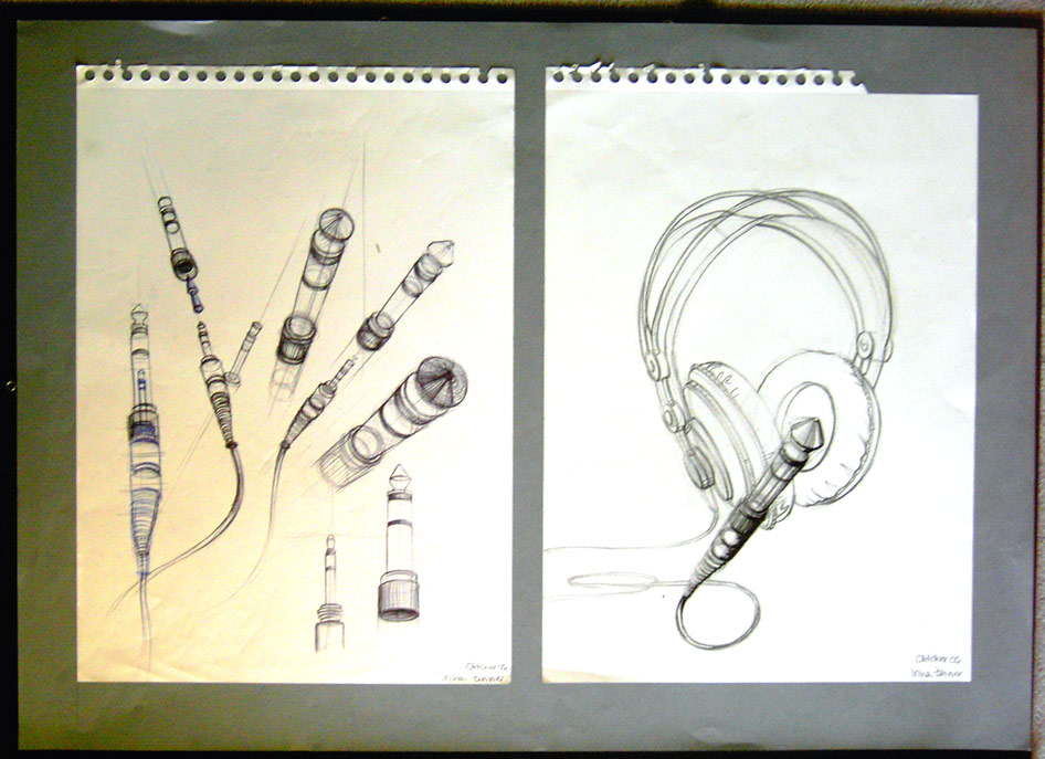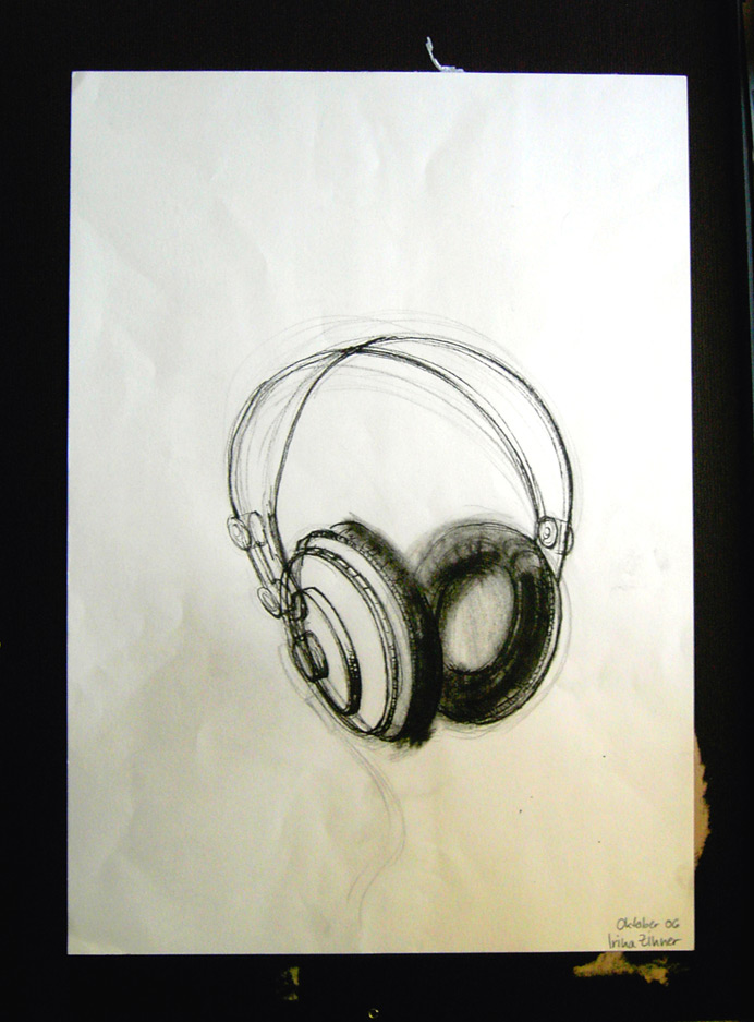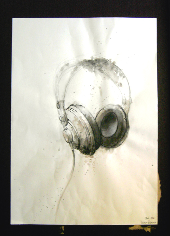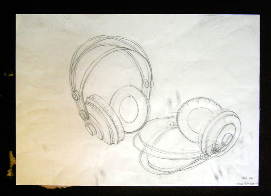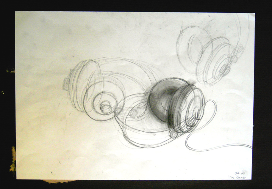 Bei der ersten Aufgabe, sah das Stillleben, das wir abzeichnen sollten so aus: Ein großer Tisch, ein paar Stühle kreuz und quer darum, ein Einkaufswagen mit zwei großen Papprollen und viiiiiel, viiiiiiiiiiel (noch mehr!) zeknülltes Papier (so ganz langes/breites) auf den Stühlen und dem Tisch drapiert. Die Zeit für die ersten Aufgaben war echt richtig heftig! Für die Bleistiftzeichnungen gerade mal 15 Minuten pro Blatt, da bleibt keine Zeit um großartig nachzudenken oder Fluchtpunke zu planen. Einfach alles durchziehen auch wenn es vor Fehlern nur so strotzt!