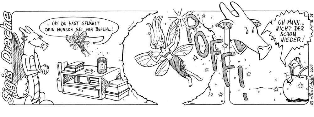 Vielleicht in deinen Panels eine kurze Info was der Drache eigentlich von der Fee will ?! Das er ein Wurmloch wünscht? .. (das war z.b. auch bei deinem Strip mit Albert schwer zu erkennen, was denn ausversehen von der Wolke gefallen ist. eine kleine Beschriftung des Behälters hätte viele Fragen im Vorfeld geklärt ^^)