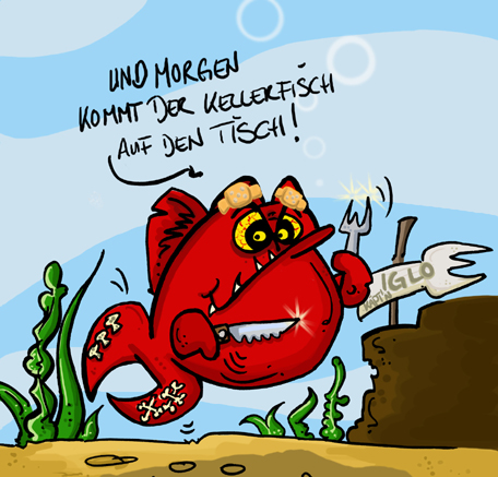 Cooler Fisch, nur find ich den Mundwinkel etwas vewirrend, weil der nochmal nach oben geht. Das mindert die Grimmigkeit ungemein. Die Augenbrauen über dem Fisch passen auch nicht zu denen weiter unten.
