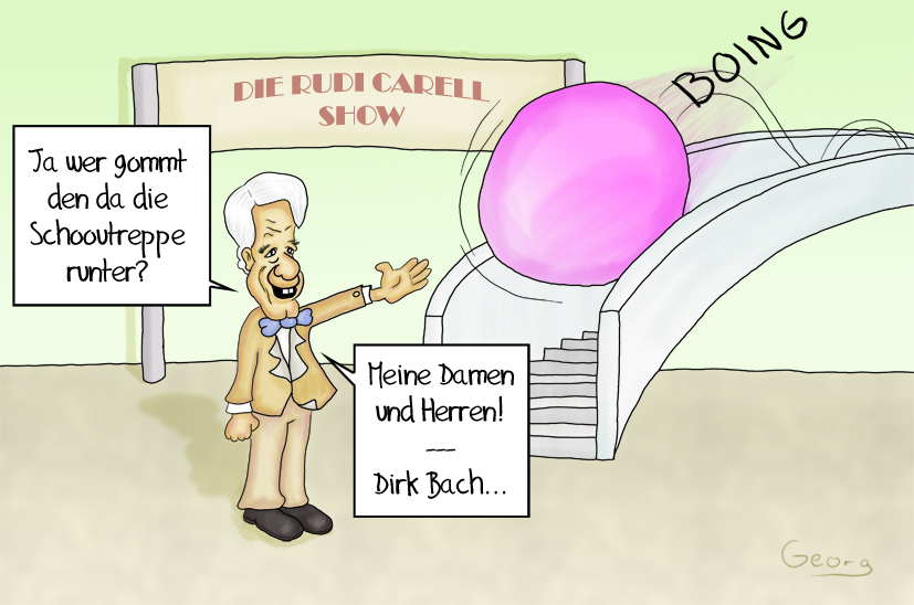 Rudi (ein großartiger Showmaster und Mensch, soweit ich das noch mitbekommen habe), war sich ja selber für keinen Gag zu schade, selbst wenn er noch so schlecht war. Ich fand es halt irgendwie lustig, ihn mit einem so schlechten Witz wie mit der Dirk Bach "Karikatur" zusammenzubringen (Johnson hat das eigentlich schon erklärt, aber noch mal kurz: Dirk bach ist wirklich kugelrund und hat immer sehr knallige Sachen, meist in rosa an. Schwul oder nicht, war mir ziemlich egal.). Ursprünglich waren da tatsächlich Stummelbeine und Rufe vom Bach mit drin, allerdings gefiel mir die Idee so noch besser. Aber ich gelobe Besserung