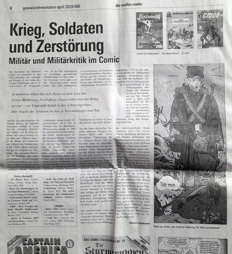 In der graswurzelrevolution #486 findet sich wieder ein Comic-Sekundär-Beitrag von Maurice Schuhmann, diesmal über Militär und Militärkritik im Comic.