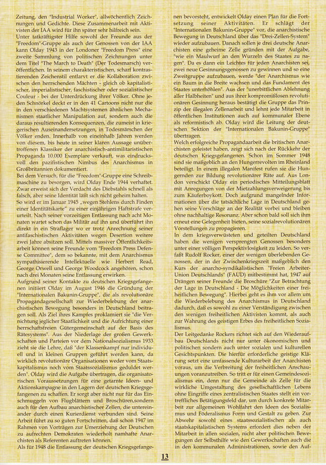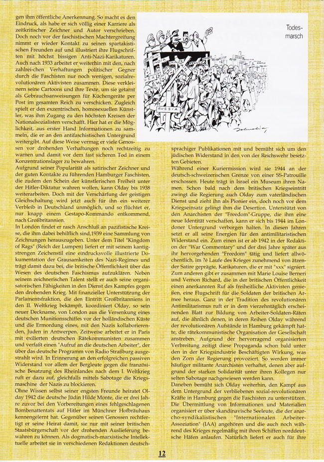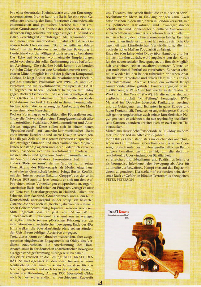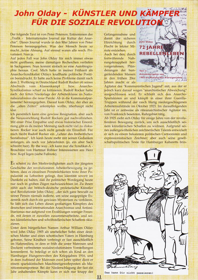 Artikel über den politischen Aktivisten, Zeichner und Autor John Olday von Peter Peterson in Der schwarz-rote Bote No. 9, dem unregelmäßig erscheinenden Mitteilungsblatt des Medienvertriebs Syndikat-A, Moers: