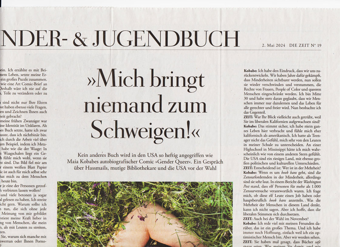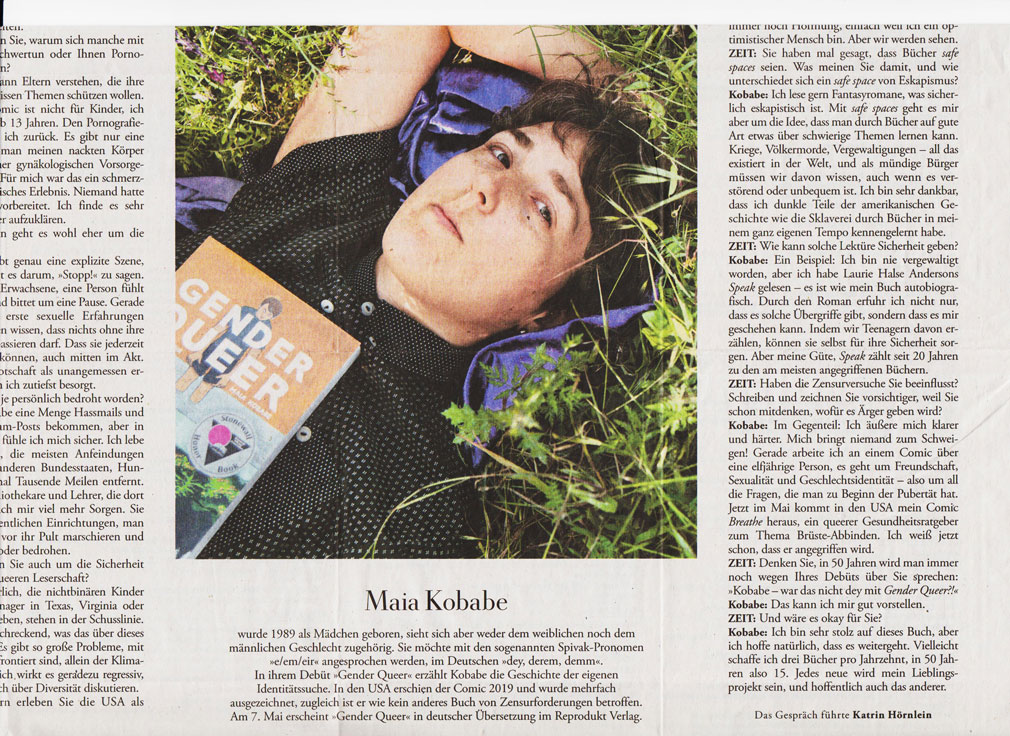 Am 2. Mai 2024 erschien in DIE ZEIT ein Interview mit Maia Kobabe, das Katrin Hörnlein mit ihr*ihm über ihren*seinen autobiografischen Comic "Gender Queer" führte.