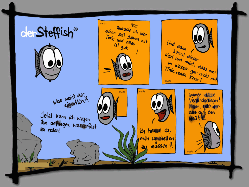 Ergebnis dieses Comics ist, dass mein Fußboden übersäht mit blauen Tintenflecken war, auch die Wand und ein Stuhl, ebenso mein linker Fuß. Ich hab eine kaputte Tintenpatrone im Füller platziert - und erst nach einer Minute herumlaufen mit dem Füller bemerkt, dass es da tropft wie aus dem Wasserhahn ...