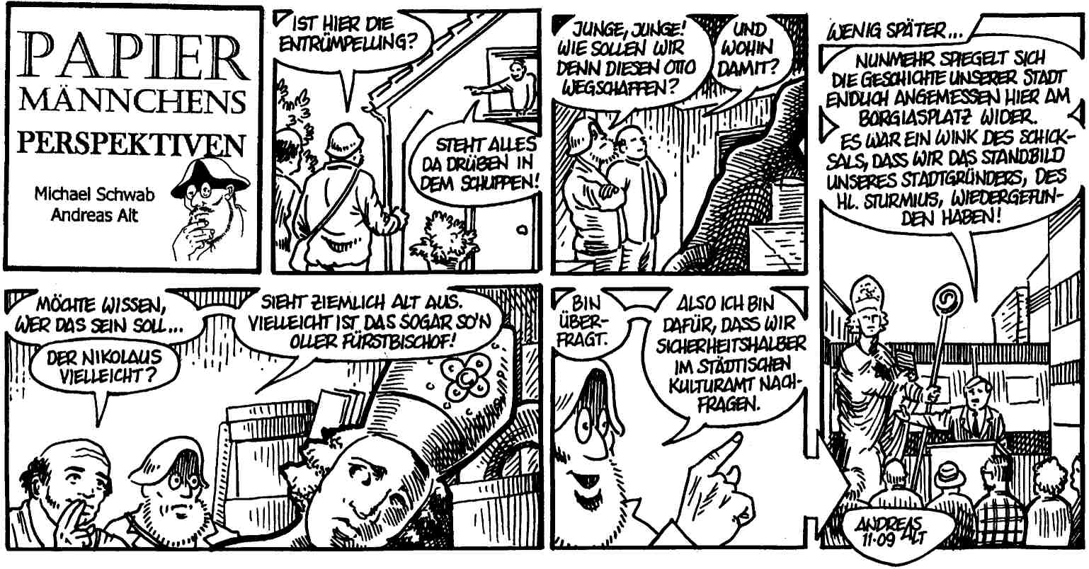 Hier die neuen Folgen meiner beiden derzeit laufenden Comicserien "Richie der Gerissene" (gibt's momentan auch als Ausstellung - siehe "Mein Abdruck") und "Papiermännchens Perspektiven". Die Richie-Episode ist vermutlich leicht zu verstehen - wenn nicht, hab' ich was falsch gemacht, die Papiermännchen-Folge ist dagegen sehr speziell lokalbezogen, obwohl das Wesentliche auch drinsteht: Sturmius war der erste Abt des Klosters Fulda und damit der Stadtgründer, und eine Statue von ihm wurde erst kürzlich bei einem Fuldaer Restaurator gefunden und dann schleunigst an einem zentralen Stadtplatz aufgestellt.